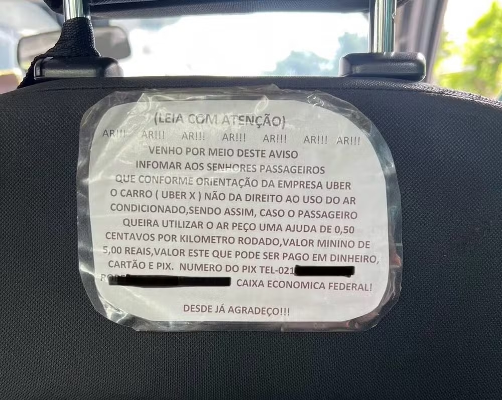 Um episódio curioso aconteceu nesta semana. A advogada Karina Bruno foi pega de surpresa na última terça-feira (12) ao iniciar uma viagem com um motorista do aplicativo da Uber e perceber um aviso colado atrás do banco do carona. A nota informava que seria cobrada uma taxa extra de cinco reais, por quilômetro rodado, para ligar o ar-condicionado durante as corridas.