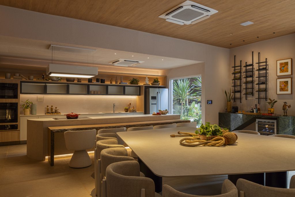 Completando o roteiro, a Cozinha Origem, assinada por Diego Studart, celebra o convívio em torno da mesa. Minimalista e acolhedora, foi pensada para encontros gastronômicos durante a mostra, reforçando o papel da cozinha como coração da casa.