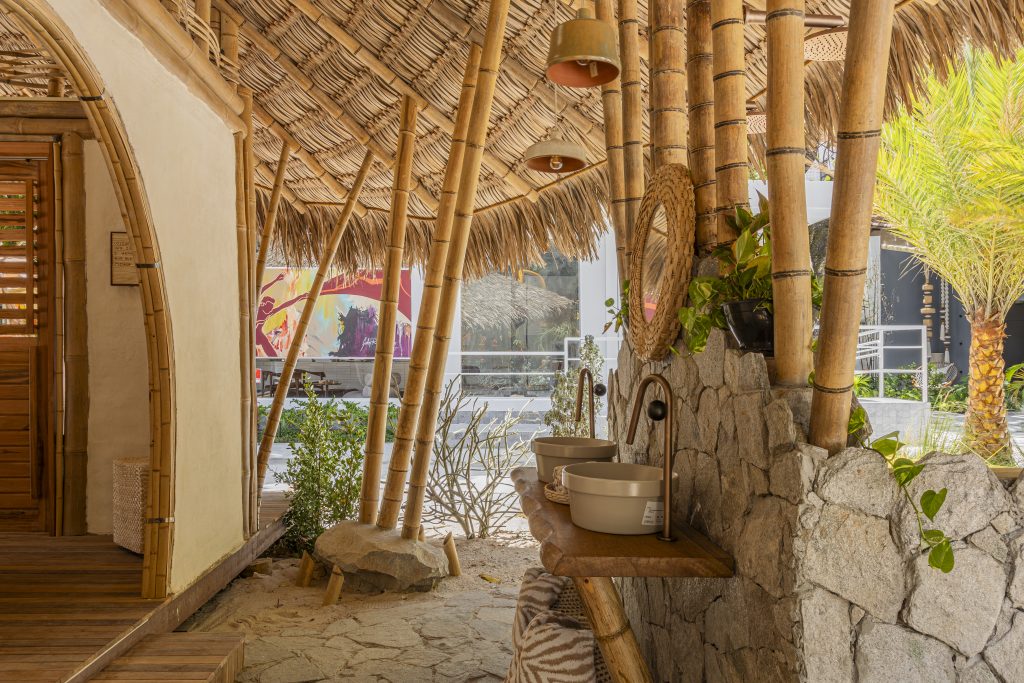 No Bangalô Duna, de Julia Gasparini, toda a estrutura foi executada em bambu pela Bambugalô, reforçando o compromisso com a construção natural. O espaço convida à simplicidade e à reconexão com a terra, em um equilíbrio entre ancestralidade e modernidade.