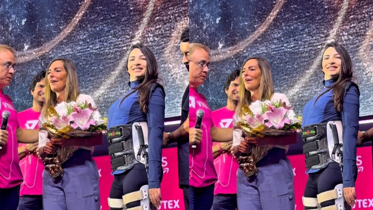 A atleta Laís Souza emocionou ao aparecer em pé durante a premiação “VTEX Day 2026”, nesta quinta-feira (16). Durante o momento emocionante, a ex-ginasta entregou um prêmio à pesquisadora Tatiana Sampaio. “Foi a primeira vez que apareço de pé em público e deu muito frio na barriga”, disse Laís.