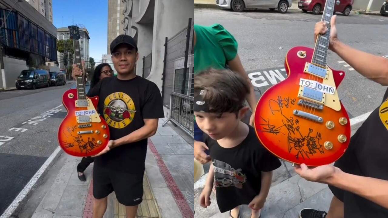Um fã brasileiro do Guns N’ Roses viveu um momento emocionante durante a passagem da banda por Belém, no Pará. O videomaker John Vitor, de 29 anos, natural de Manaus, conseguiu ter sua guitarra autografada por todos os integrantes do grupo após viajar exclusivamente para assistir ao show realizado no Mangueirão, no sábado (25).