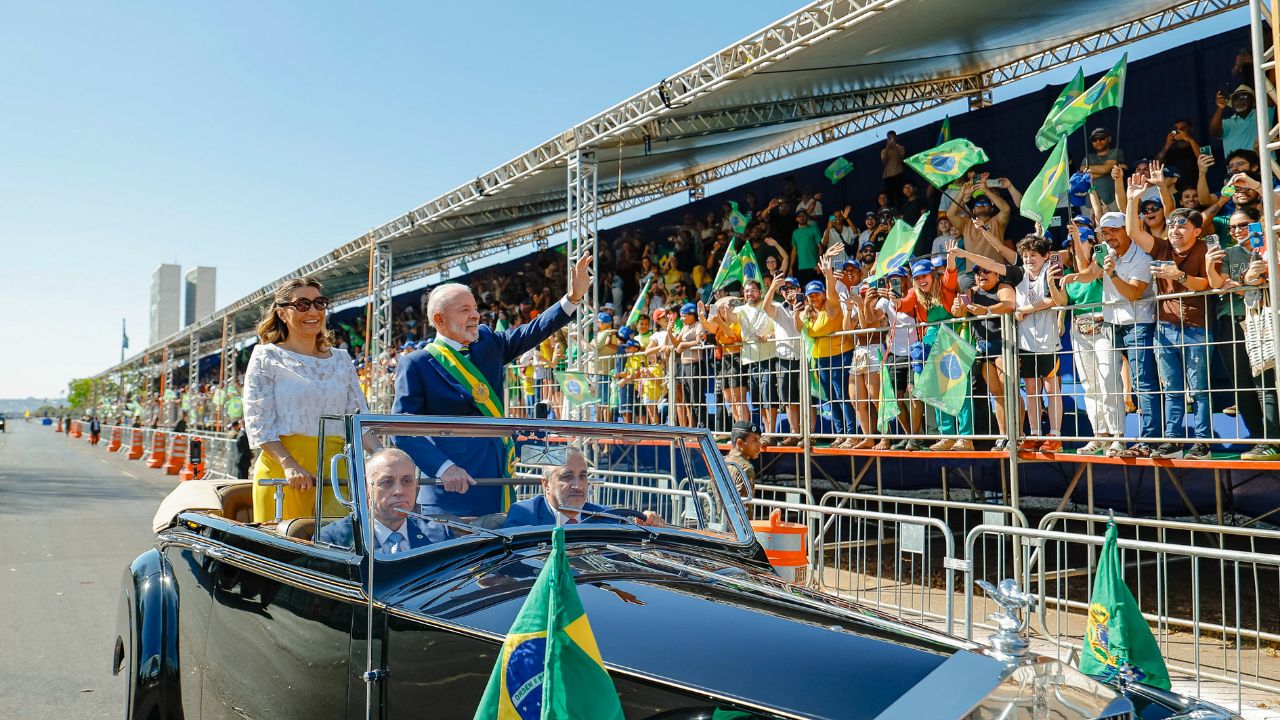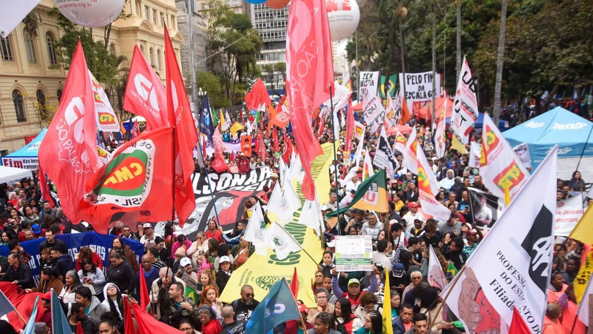 Os manifestantes também pedem o fim da escala 6×1 e exibem cartazes de “Brasil soberano” e “o Brasil é dos brasileiros” em mensagem contra o tarifaço de Trump
