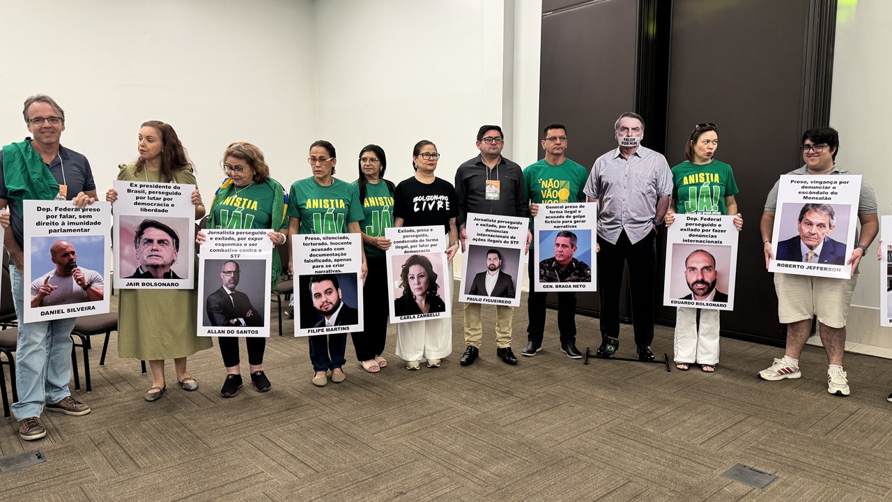 Na manhã deste domingo (30), em evento político em Fortaleza, grupos exibem cartazes com rostos de nomes polêmicos vinculados ao bolsonarismo.
