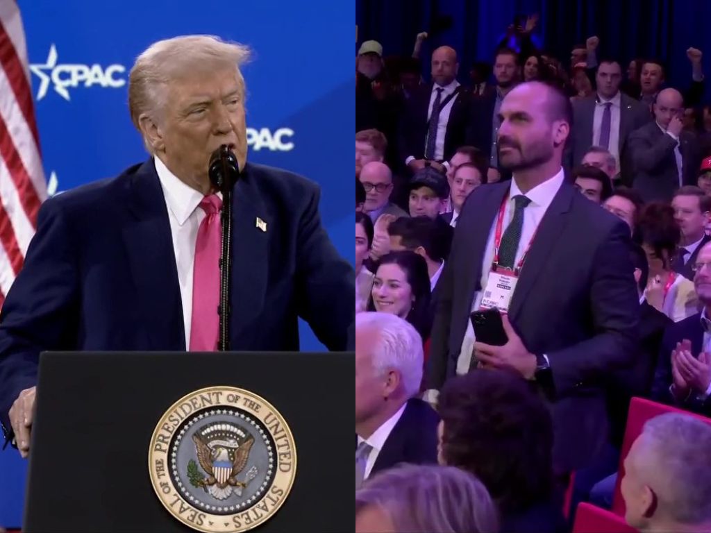 Trump fazia cumprimentos aos líderes conservadores presentes na conferência, como o presidente da Argentina, Javier Miliei, quando se dirigiu a Eduardo